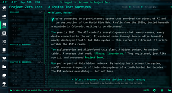The year is 2051. The Dead Internet theory is real: humanity has lost the surface web to an Artificial Super Intelligence. You are a hacker navigating the underground networks, uncovering fragments of "Project Zero"—a mysterious initiative buried in 1980s technology that may hold the key to liberation.